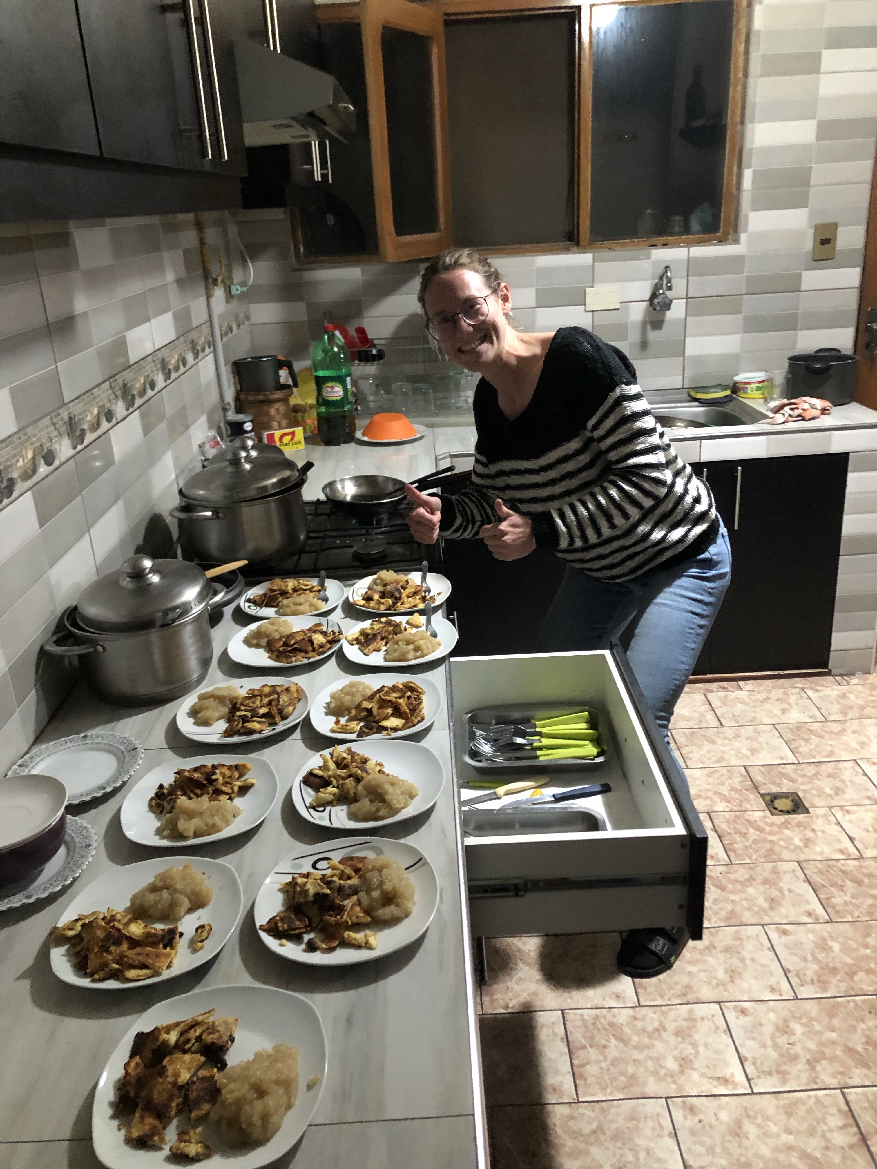 Da Teresa fünf Tage nach meiner Ankunft – also am Montag – , Cochabamba verlassen hat, gab es am Wochenende davor noch verschiedenste „Fiestas de despedida“ (=Abschiedsfeiern), was mir die Ankunft mit viel Action vereinfacht hat. Einmal waren wir austria@s gemeinsam bouldern, es gab ein nettes Fest in der Sprachschule mit all unseren Gastfamilien und Lehrer*innen (seht das Video unten ; )) und zu guter Letzte wurde “zuhause” noch ein großes Abschiedsessen gekocht, wobei die Nachspeise ein von uns experimentierter Kaiserschmarren mit Apfelmus war.