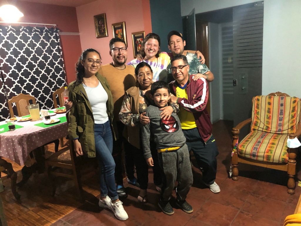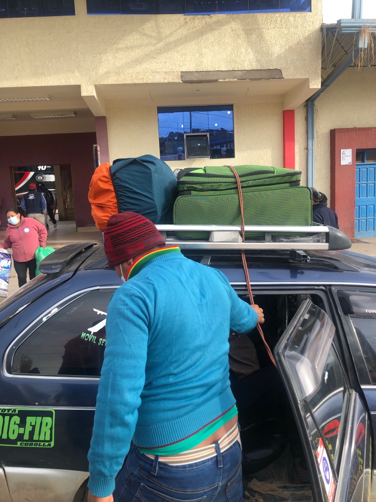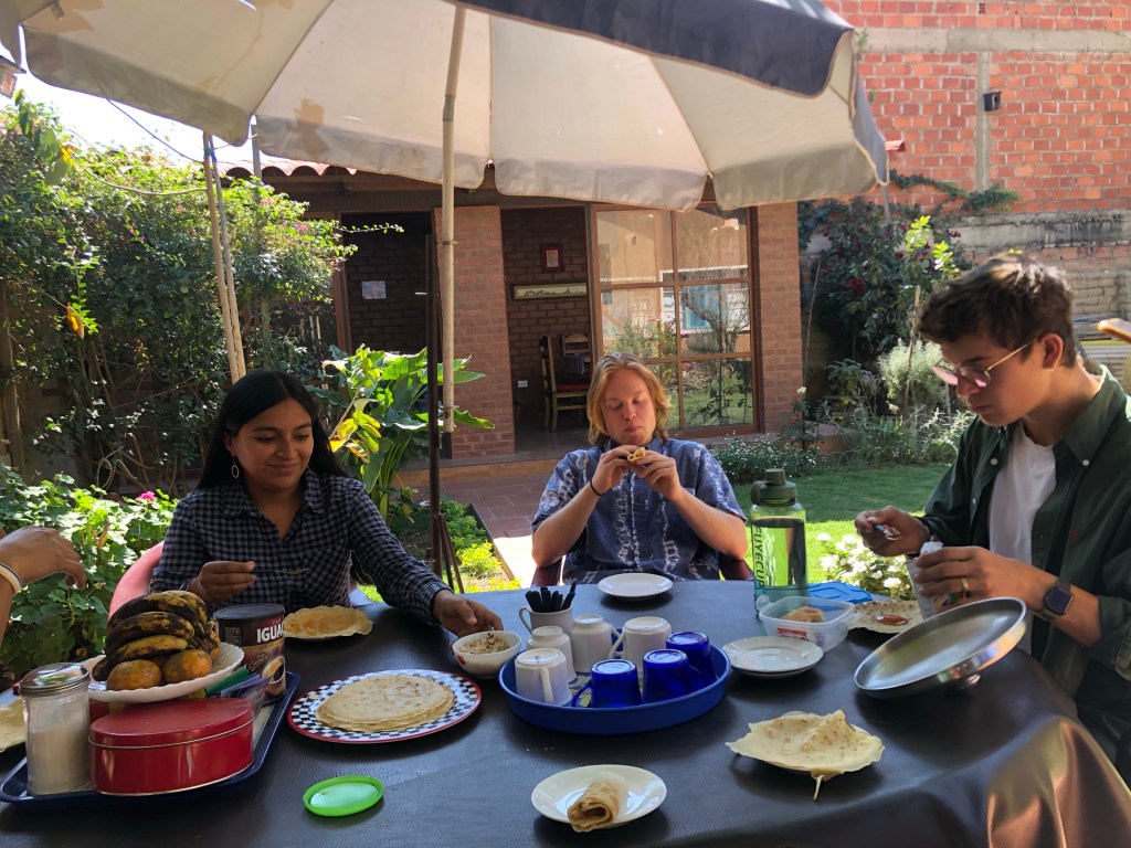 Am Mittwoch wurde es dann „ernst“, traurig und auch spannend zugleich. Nach der letzten Unterrichtseinheit – die mir nochmal den ultimativen Kick gegeben hat – gings ans Zusammenpacken und wir fuhren zum Busterminal, um uns dort einen Sitzplatz für die Nachtfahrt nach Potosí zu reservieren. Als alles fertig gepackt war, genoss ich noch die letzte Zeit mit meiner Familia. Wir quatschten, kochten Pizza für das Abschiedsessen, spielten nochmal Tischtennis und ich übergab mein Abschiedsgeschenk – einen sehr kunstvollen Serviettenständer (handgemacht von einer anderen sehr netten Gastmama). Wie’s natürlich sein muss, wurde zum Ende hin alles noch recht stressig. Ich hatte mich noch nicht von zwei meiner Sprachlehrer*innen verabschiedet, weshalb ich noch, kurz bevor ich das Taxi zum Terminal rufen musste, bei ihnen zu hause vorbei schaute… Als ich dann im Taxi saß – eh schon recht spät dran – fiel mir auf, dass ich noch den Haustürschlüssel in meiner Tasche hatte (kleiner FunFact am Rande: am Vormittag ist genau dasselbe dem Ehepaar passiert, das in der gleichen Familie wir ich wohnte, also hätt ich echt daran denken können…) Jedenfalls drehten wir nochmal um und – wisst ihr was – ich hab halt einfach auch ein wichtiges Tascherl vergessen… also es bestätigt sich mal wieder: