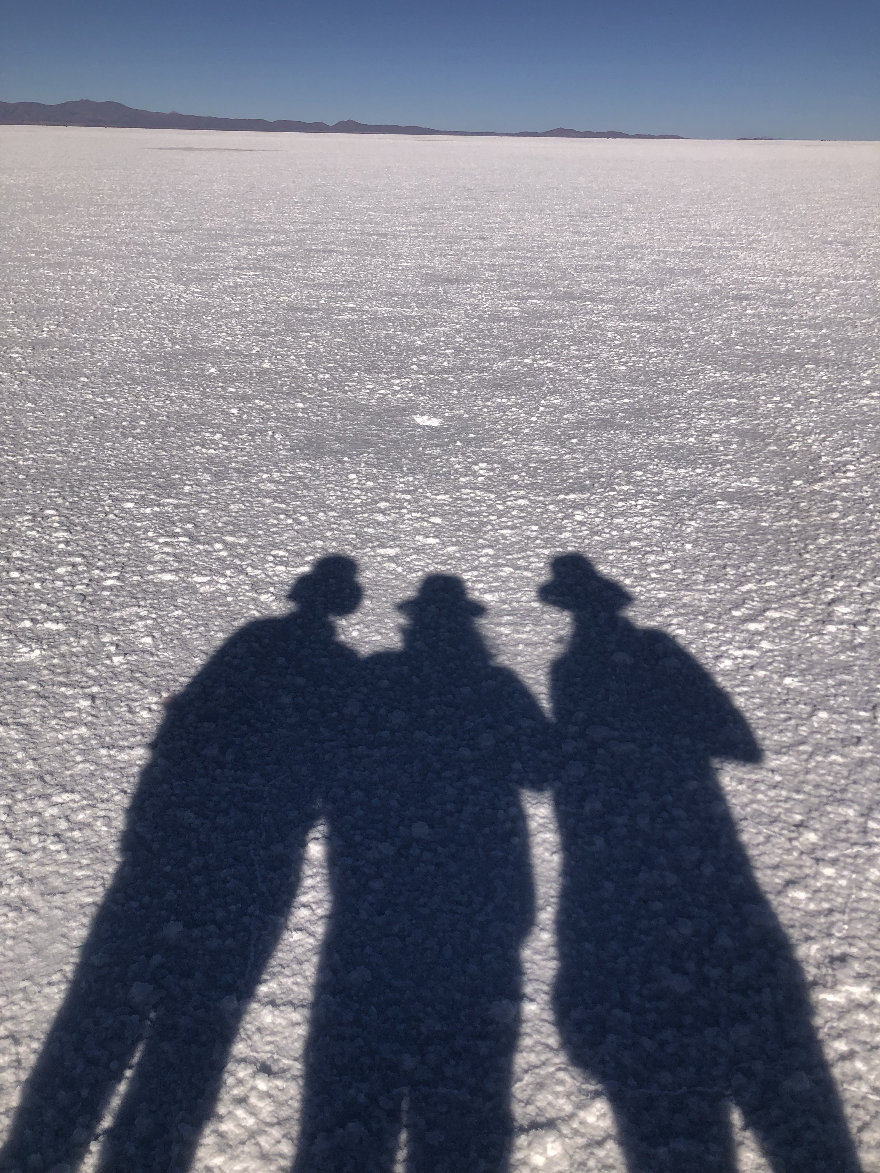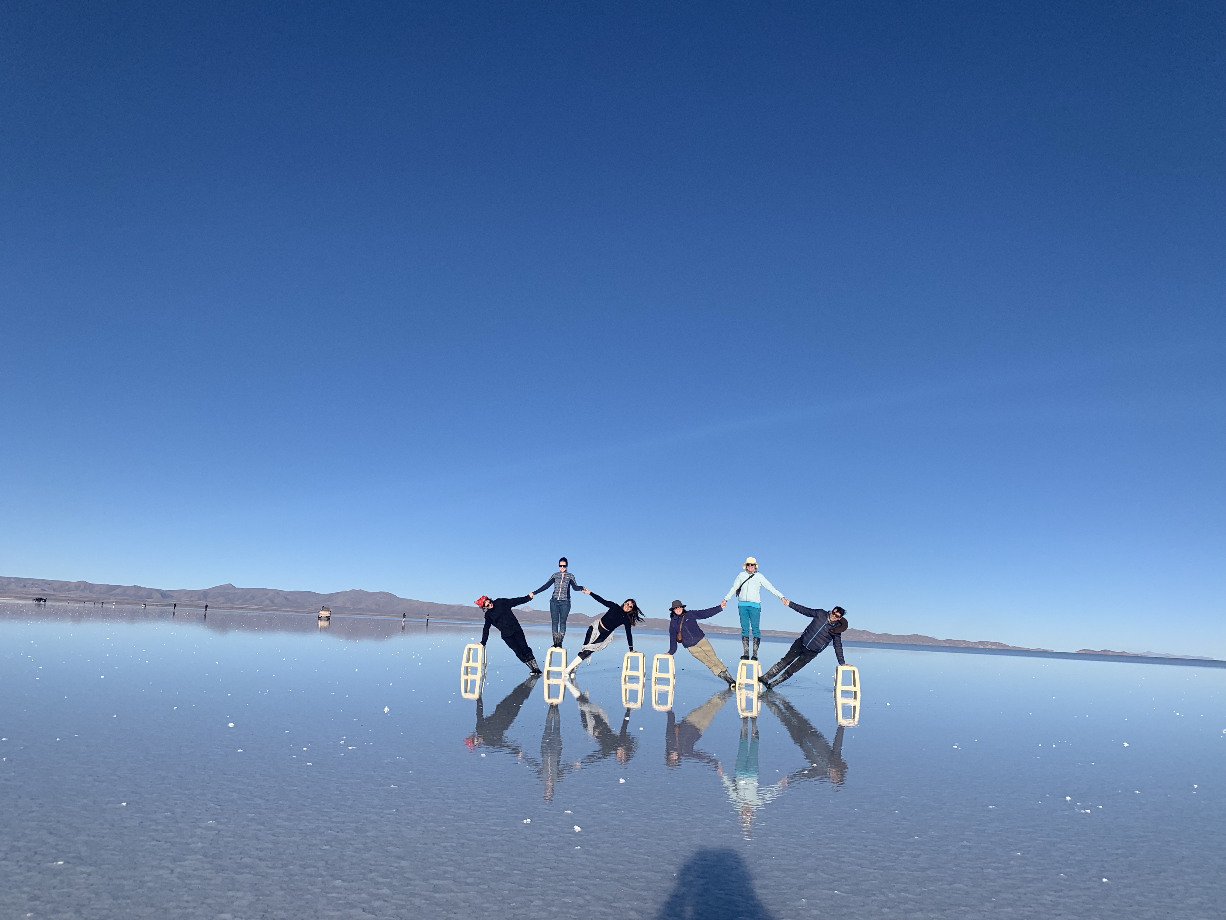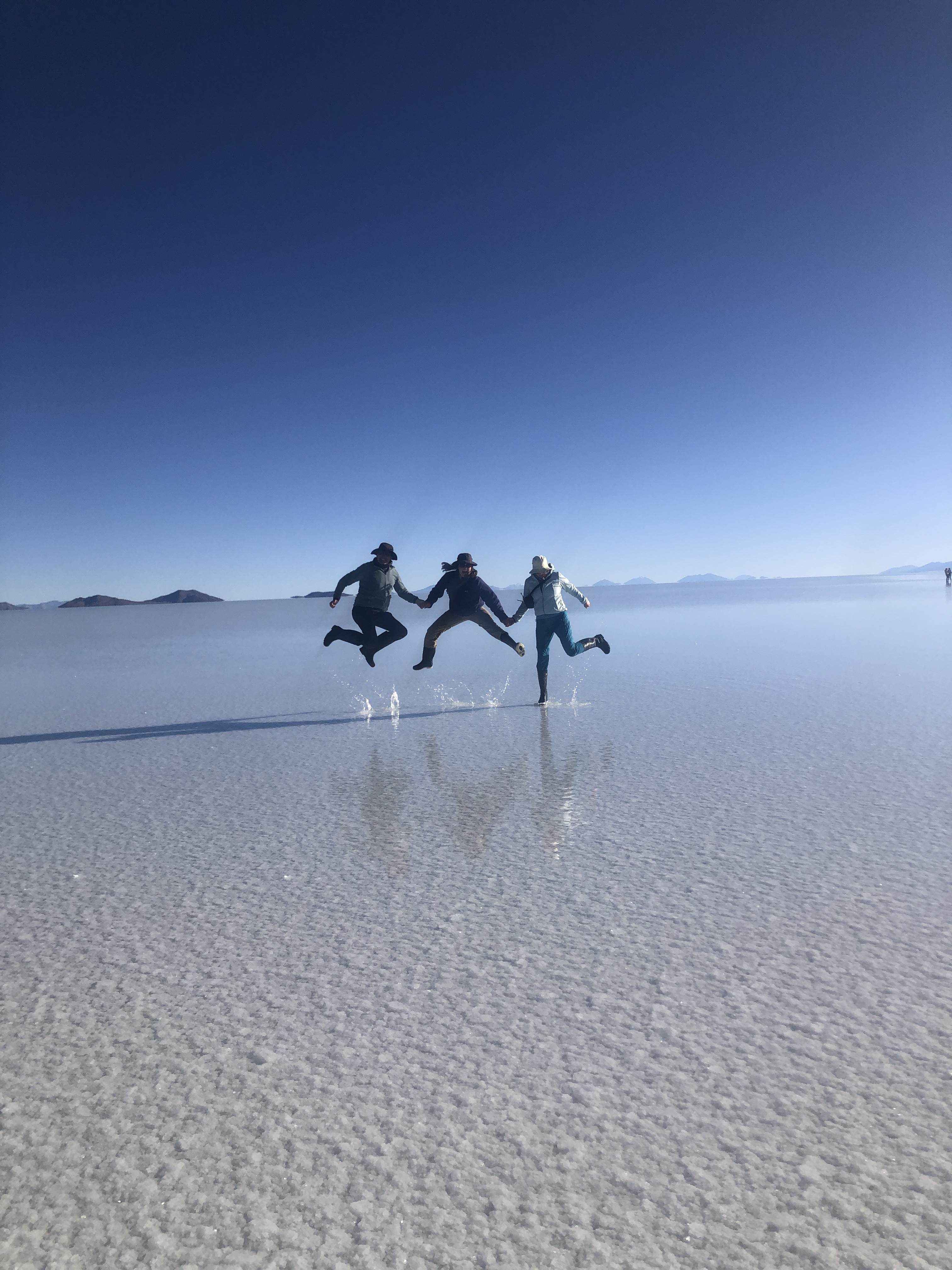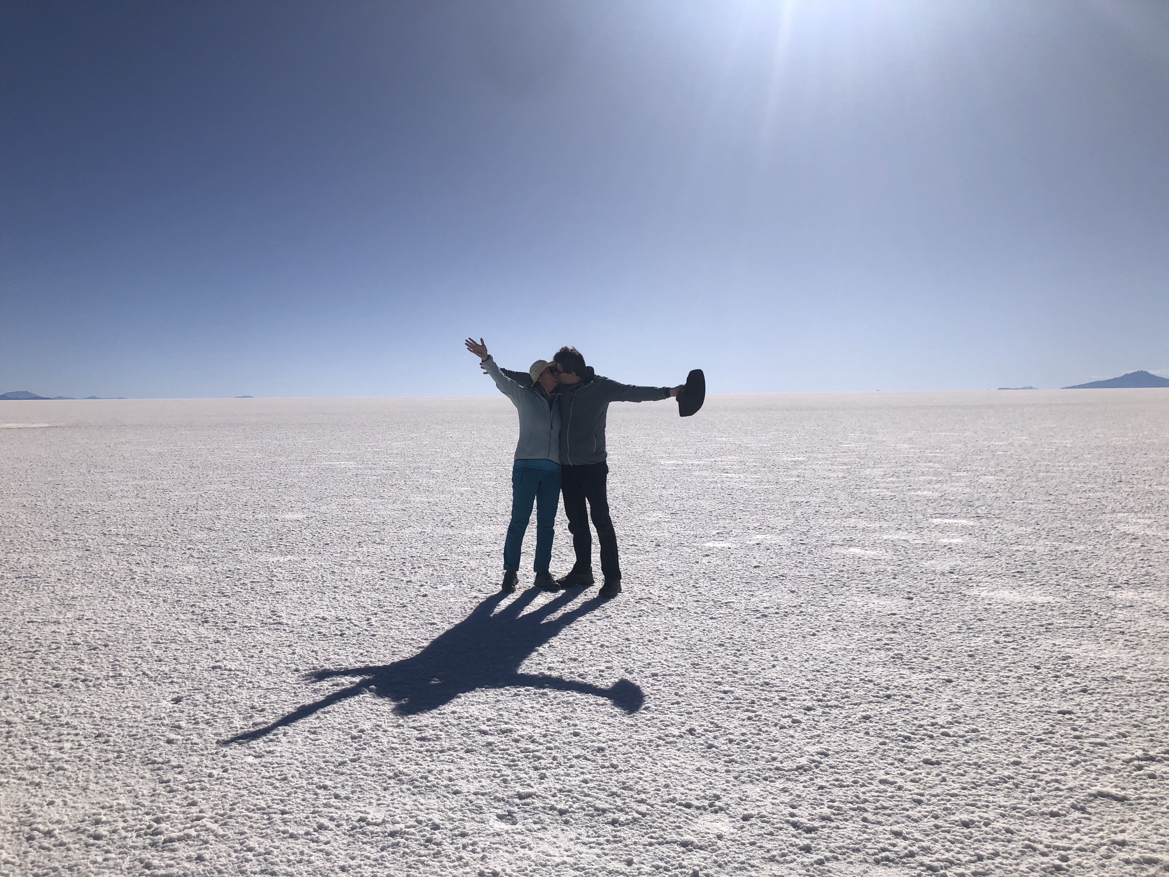 Den ersten Tag nach unserer etwas bolivianischen Ankunft – verspätet halt – gings mit unserem Fahrer und guía Franz/Francesco/Pancho ; ) in die Wüste aus Salz. Super interessant! Wir sahen diese unendliche Weite – machten natürlich die typischen Täuschbilder – den Spiegeleffekt, der dadurch entsteht dass eine Schicht Wasser auf der weißen Fläche steht und es sich somit spiegelt, machten dabei ein super cooles Video und als Highlight genossen wir noch bei Wein, Bier, Snacks und Musik den so fabkräftigen Sonnenuntergang…