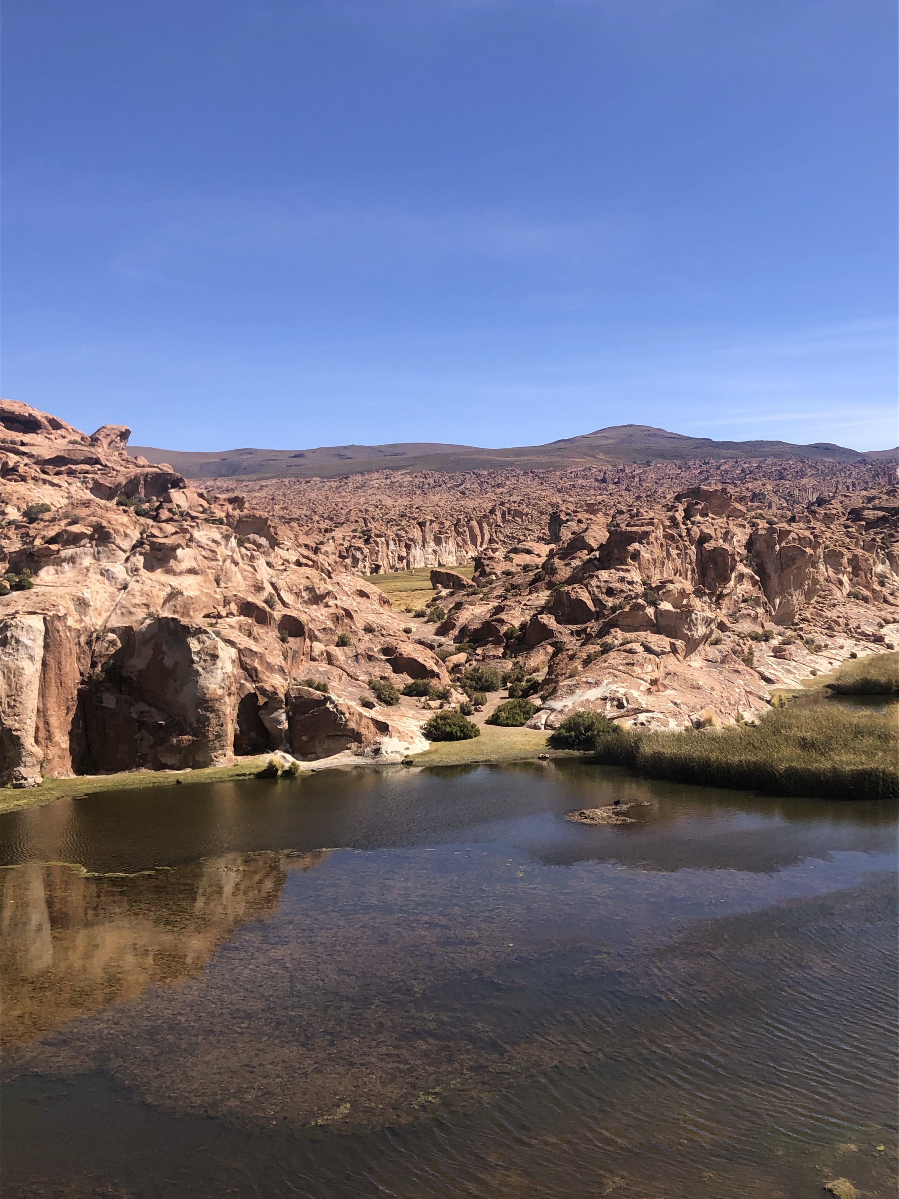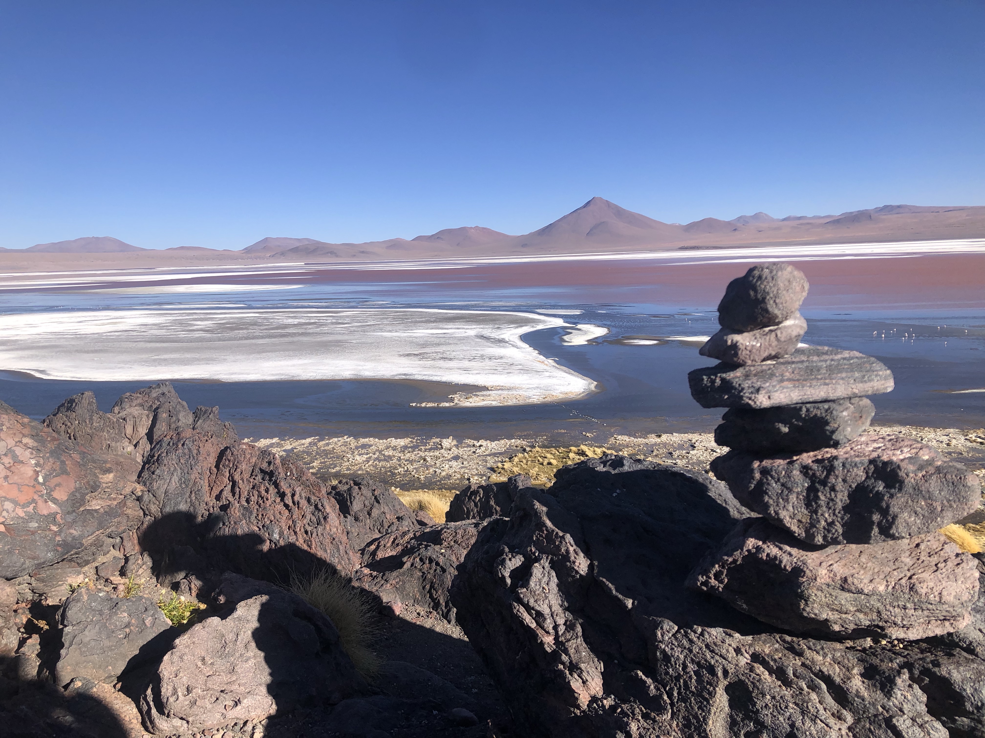 Nach dem echt leckeren Pancake-Frühstück gings auch schon wieder zurück nach Uyuni. Der Weg war recht lang und wir machten auch noch einige Stopps bei beeindruckenden Orten, wie Steinformationen und auch einem „geheimen See“ der mitten zwischen Steinen im Nirgendwo liegt. Außerdem sahen wir an diesem Tag echt viele Lamaherden – die Lamas haben so einen genialen Mood. Love it!